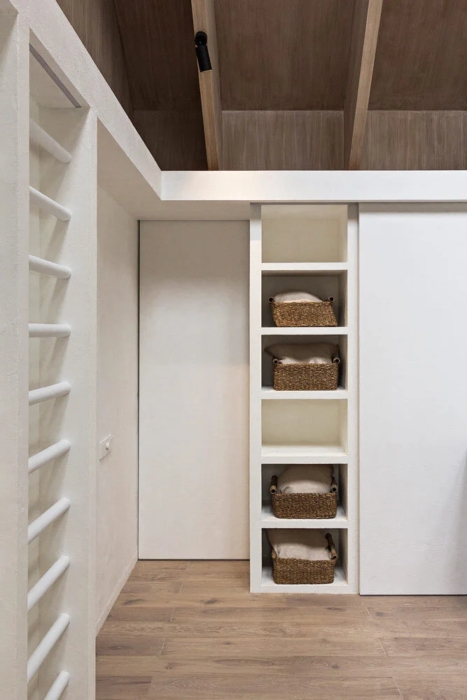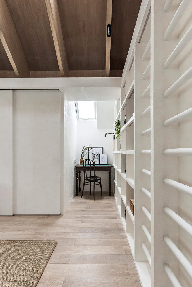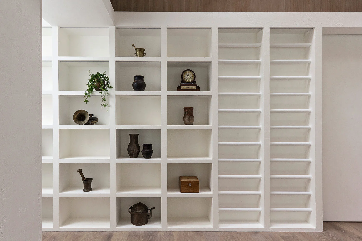 Мы разделили интерьер по вертикали на 2 материала: дерево на потолке и белая штукатурка на стенах, на фоне которых каждый предмет мебели заиграл как музейный экспонат. Для нас было важно задать настроение как на визуальном, так и тактильном уровне. Главную роль в этом сыграли матовые шероховатые и приятные на ощупь материалы, которые мягко рассеивают и отражают свет.